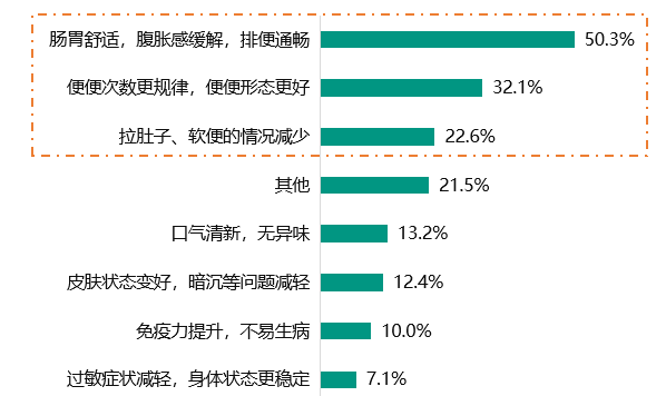 其次,肠道健康相关产品的健康功效已被消费者所认可和买单。春雨医生发布的《2023国人“肠”烦恼及益生菌消费洞察报告》指出:超过一半的消费者购买益生菌为的是肠胃舒畅。数据表明,受到肠道健康和免疫提升需求带动,2024年益生菌类产品销售额增长40%[4]。